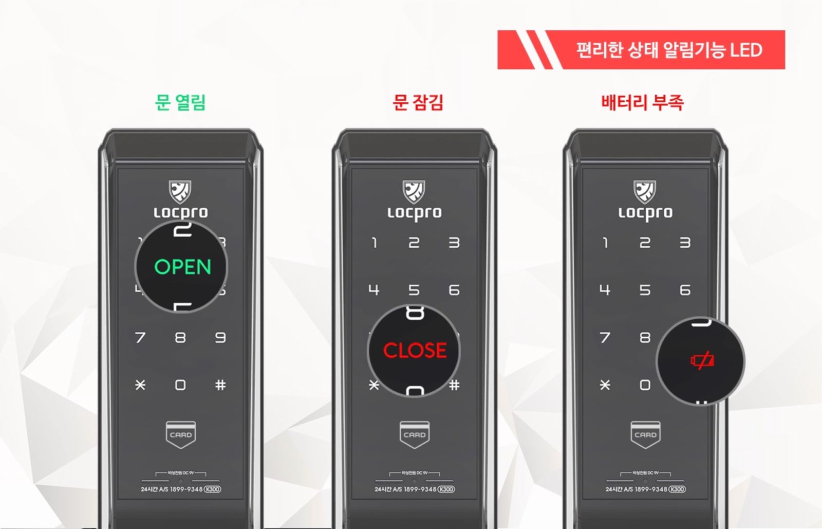 Locpro K300 được trang bị bộ đèn led thông báo tình trạng Khoá - Mở - Pin Yếu. Giúp gia chủ có thể chủ động thay thế nếu pin yếu và an tâm hơn khi biết cửa đã được chốt an toàn.